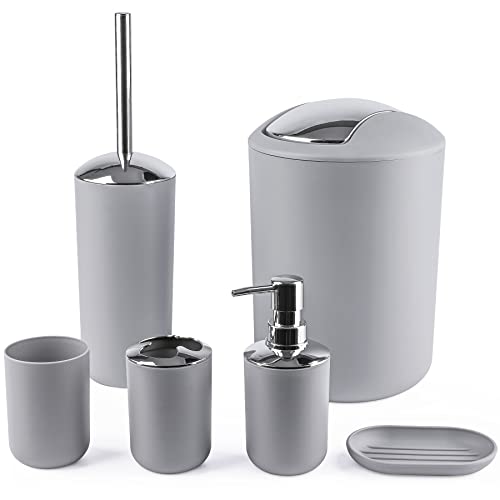 Papillon Bathroom Accessories - 6 Piece Plastic Gift Toothbrush Holder,Toothbrush Cup,Soap Dispenser & Dish,Toilet Brush Holder,Trash Can,Tumbler Straw Set (Gray)
