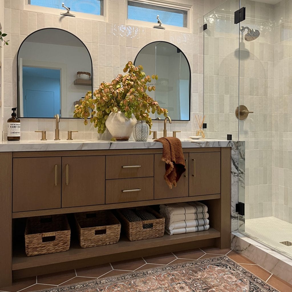 The rustic farmhouse style brings warmth and charm to any bathroom. It blends old-fashioned comfort with simple, natural designs.