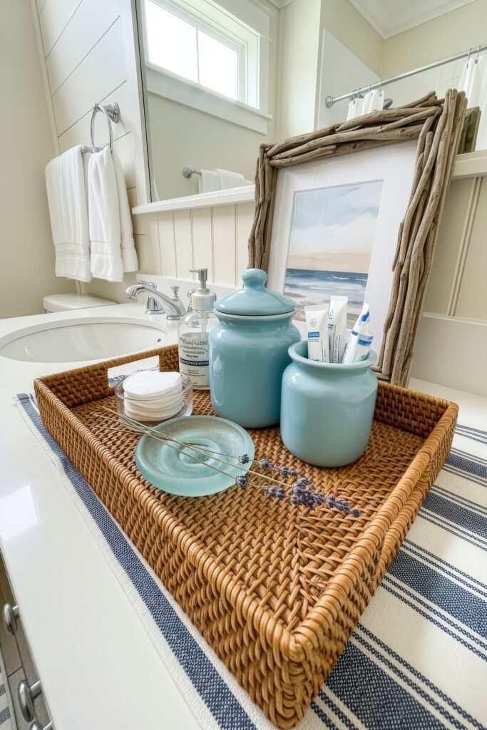 Adding personal items makes trays and jars unique. Items like favorite soaps, brushes, or jewelry add character.