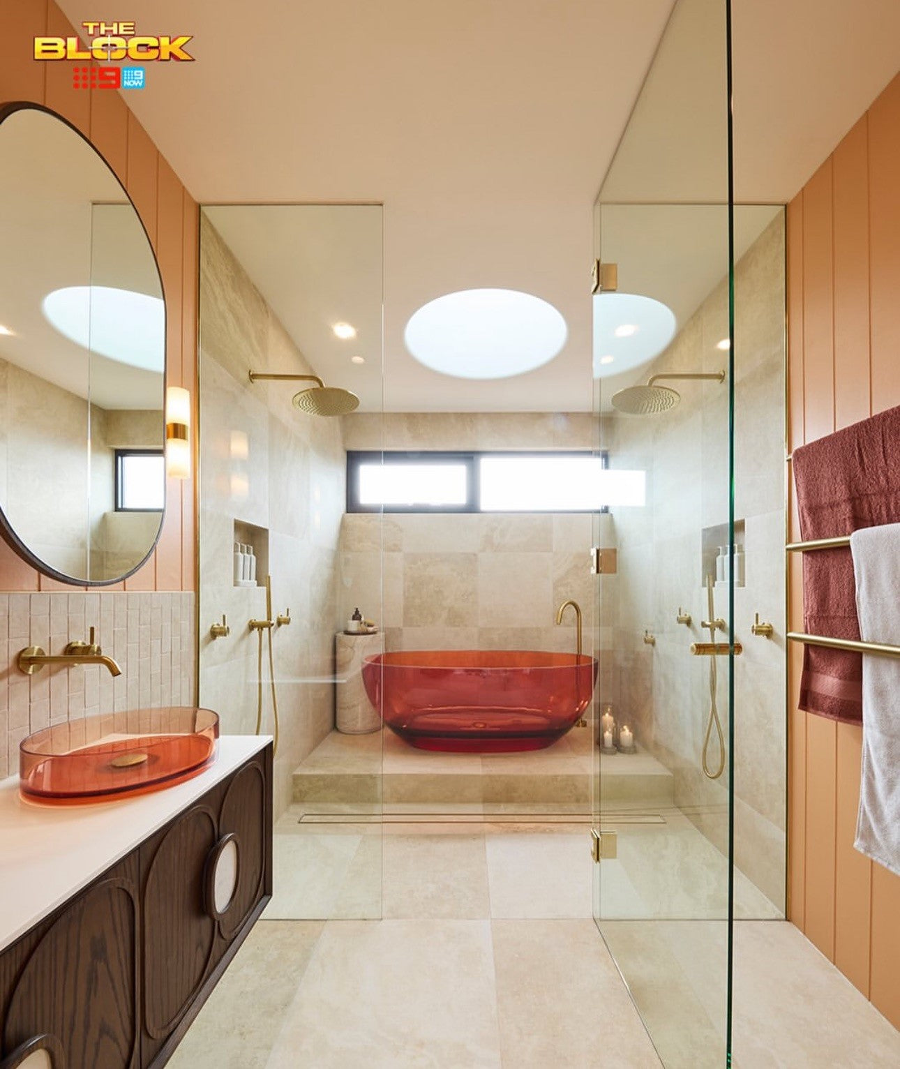 Use glass or wood shelves to match your decor. Arrange towels, candles, and plants for a personal touch.