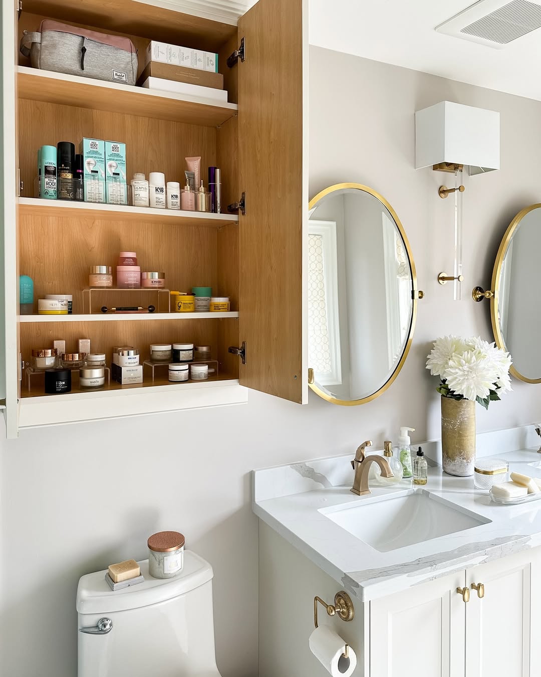 Small bathrooms often have little space. Use the vertical space above your vanity. You can add shelves or hooks on the wall. Put towels, extra soaps, or small plants there. This frees up space inside the vanity.