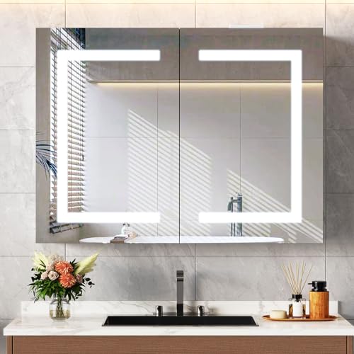 Hasuit Lighted Medicine Cabinet with Mirror, Wall Mounted Bathroom Mirror with Storage, 2 Doors Bathroom Wall Cabinet with LED Lights, 31.5'' x 23.6''