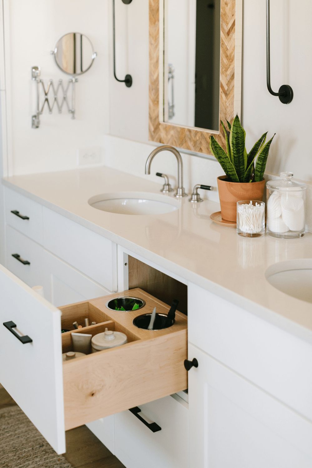Sometimes, you don’t need a new vanity. You can add storage ideas to the one you have.